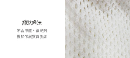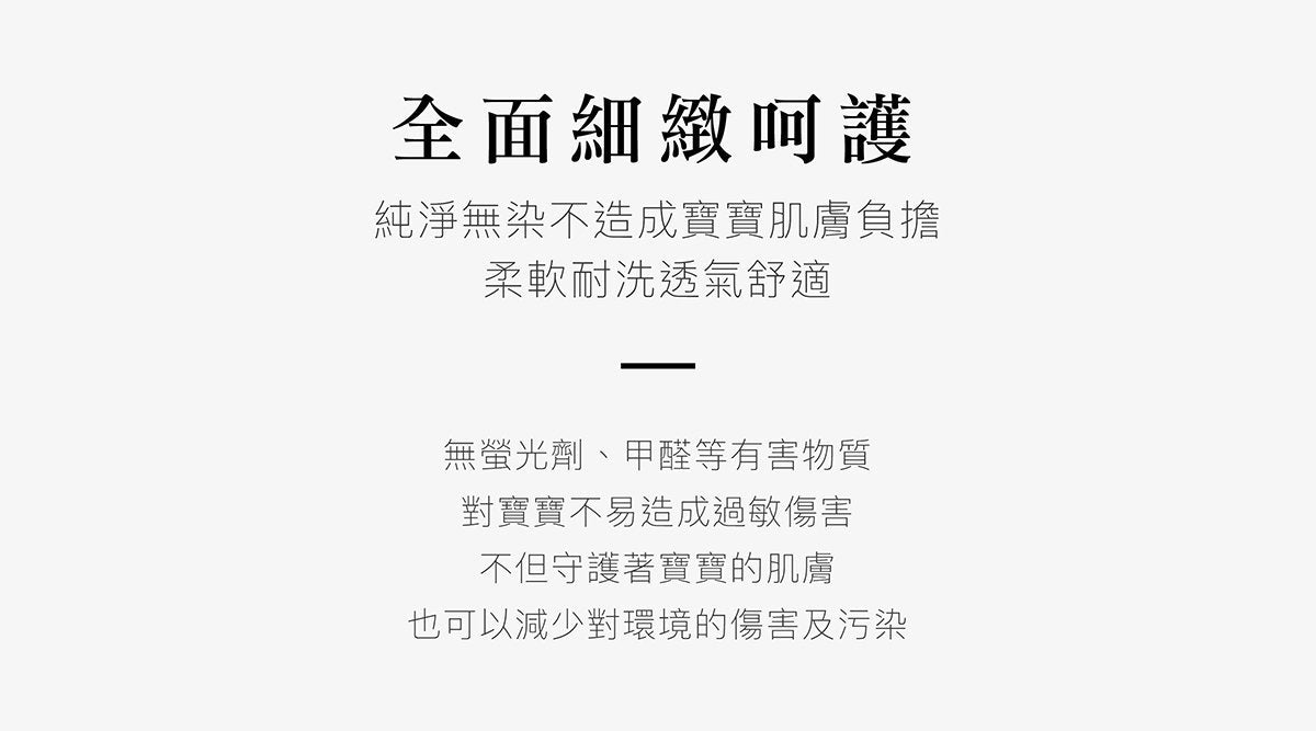 - 採用棉紗布料,不含螢光劑、甲醛,不易刺激寶寶柔嫩肌膚。